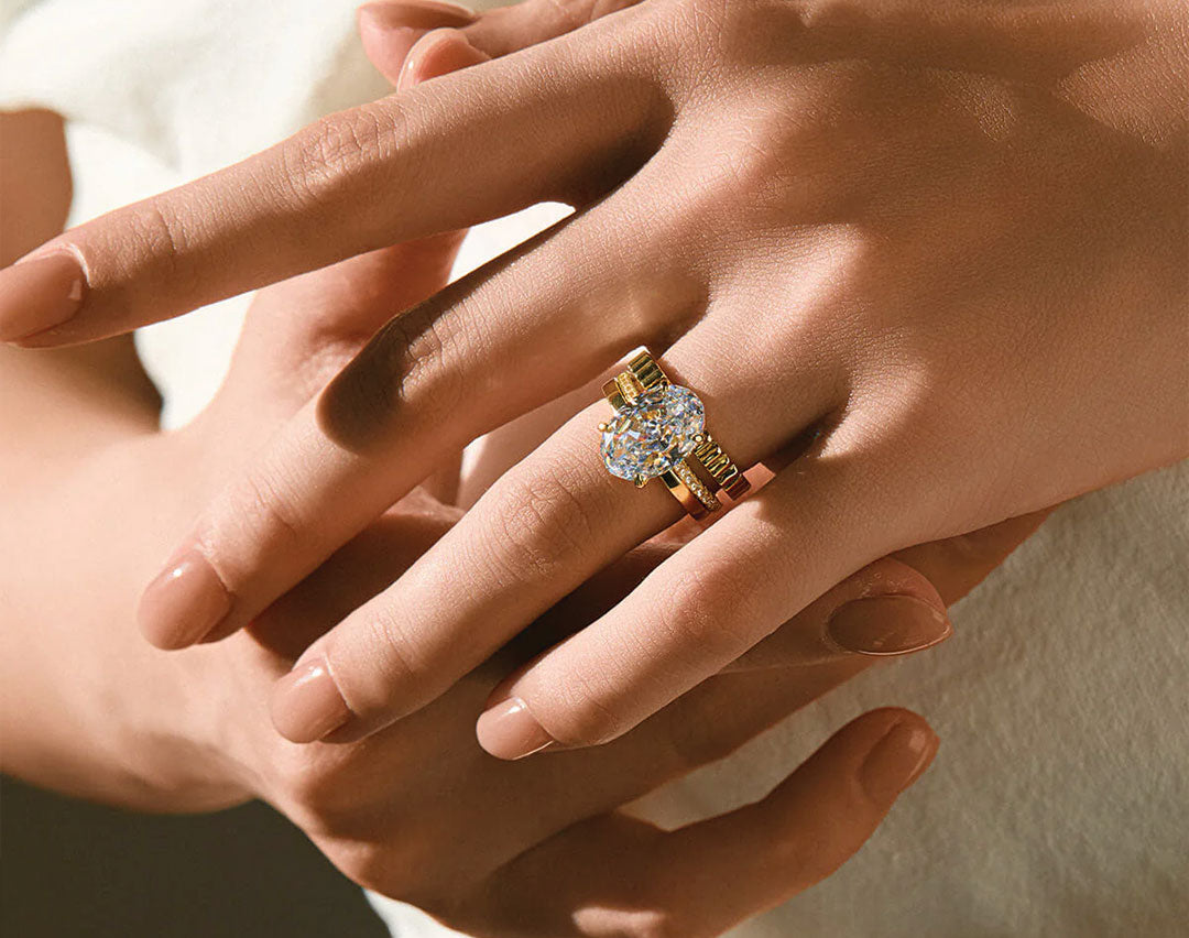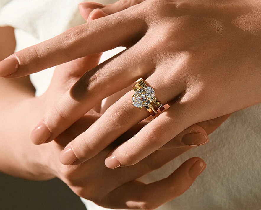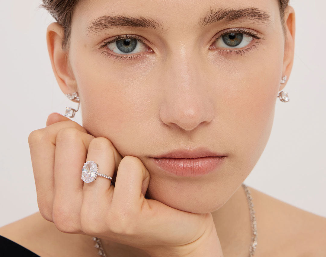 Magnum is our go-big oval ring, giving you diamond energy without the diamond spend. The oversized crushed ice centre sits on a slim pavé band with a hidden halo. It catches the light from every angle while still feeling comfortable enough to wear all day.