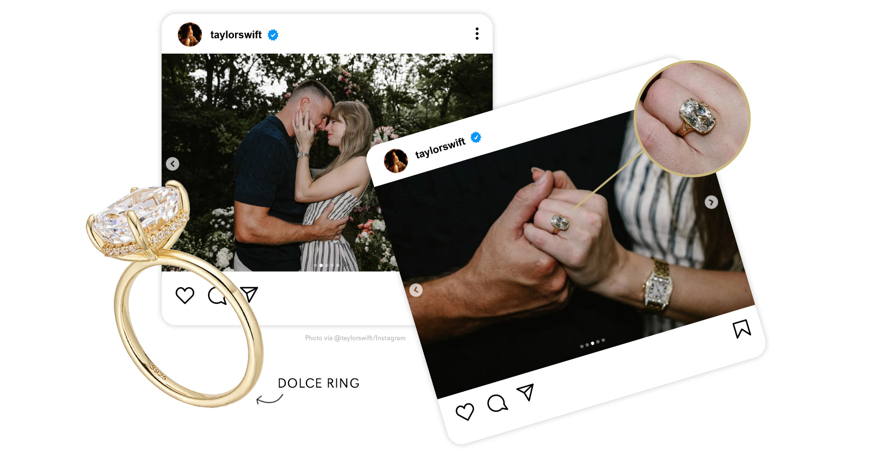 If it’s good enough for Taylor, it’s good enough for us. Her elongated cushion is poetic in every sense- soft corners and that antique glow ✨ Think micro-bezel is yellow gold, chunkier facets and a tiny culet that gives old-mine energy without the antique price. Write your own love story with Dolce for that soft cushion profile or Aurum for big, crushed-ice sparkle.