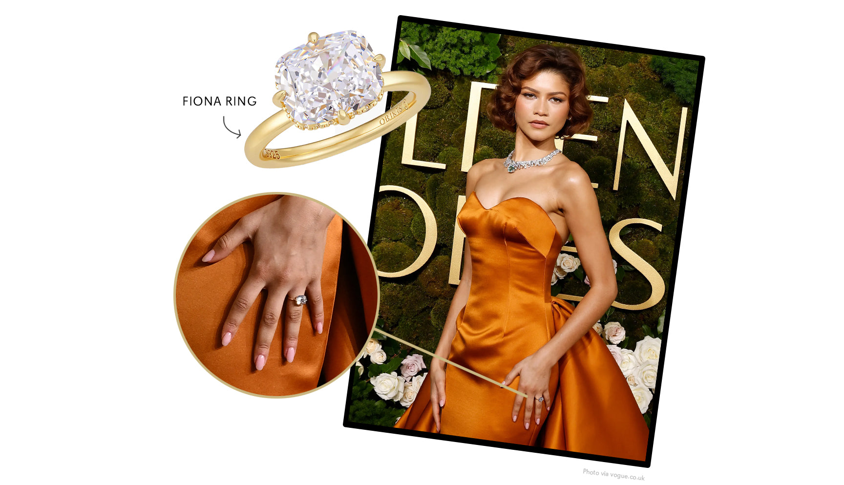 Zendaya turned the cushion sideways and the internet lost composure. Her 5 carat, east-west stone sits cozy in its Georgian-inspired setting that floods the stone with light. It feels custom, clever and quietly smug in every photo. If Zendaya’s wearing it, the trend is already here. Steal the moment with Fiona for elegant proportions or keep it slick and stackable with Elyse.