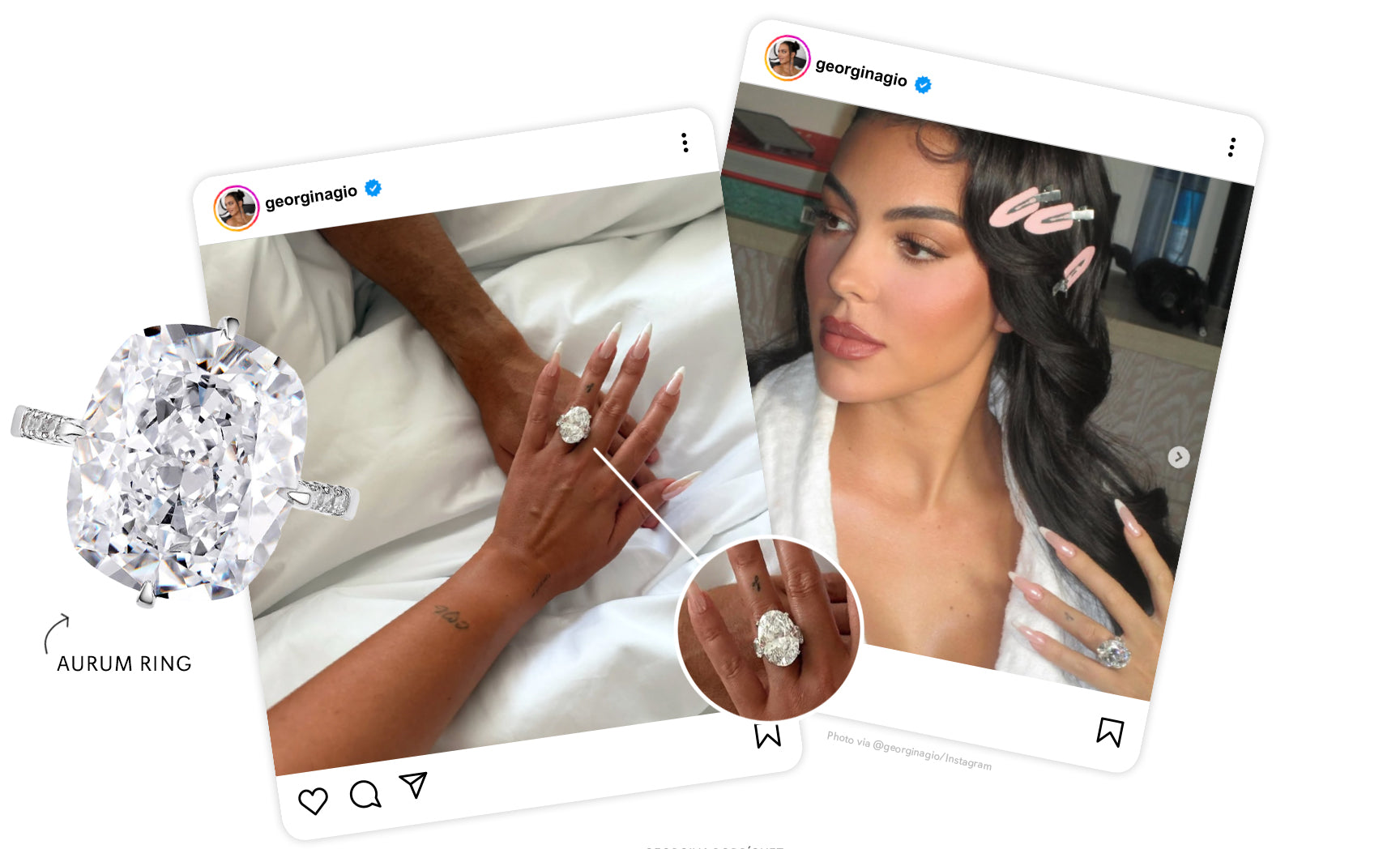Georgina’s ring demands attention. A centre oval of 30 to 35 carats, flanked by two oval side stones serve us a complete dramatic trilogy . Secure the spotlight with Aurum, our very own showstopper that brings intense fire, while Magnum serves a statement that still works for all day wear.