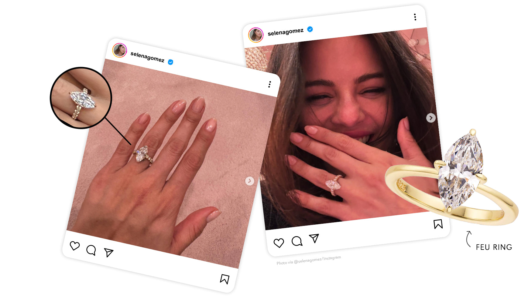 Selena truly is a marquise diamond. Her manifested ring boasts clean lines, an elongated silhouette and a pavé band for extra shimmer. Practical, romantic and built for a satisfying stack. Get the same long, elegant look without the long invoice, Choose Feu or browse our Marquise collection to find your picture-perfect gem.