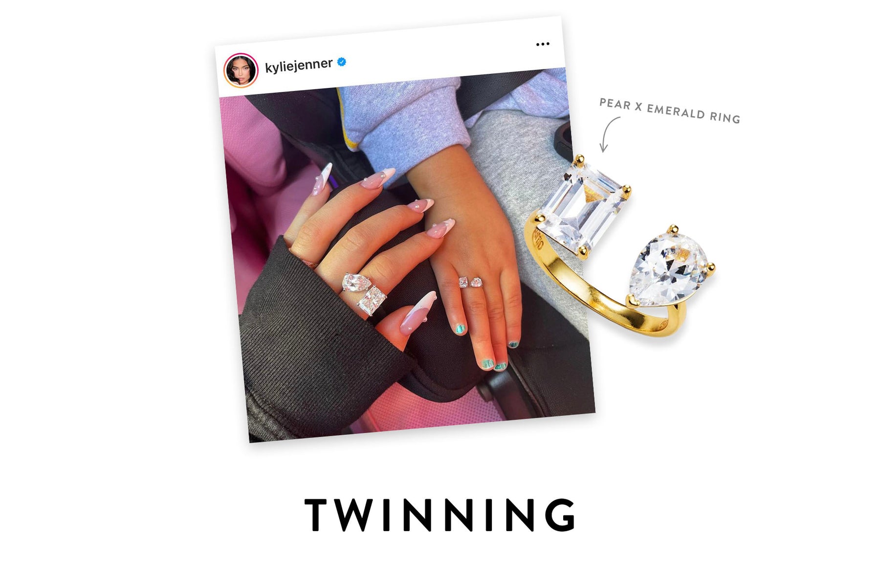 Ok, this isn’t an engagement ring but who wouldn’t wanna be matching with Kylie and Stormi?! This 2 stone open ring is so freaking cute. Doubling up with contrasting shapes creates ane ffortless yet effective look. Easy to style our Emerald X Pear ring should be your new go to.