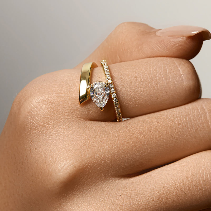 Captivating and timeless, the Vox Ring features a sophisticated design with its floating crushed ice pear stone nestled in an avante garde setting. An exquisite accessory with a luxurious appeal, it's a statement piece that is sure to make an impression.